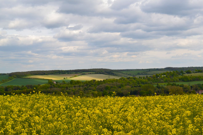 I declare bluebell time officially over. It is now the moment for hawthorn, yellow archangel, buttercups, pyramidal orchids and so on to take centre stage, along with flowering trees like horse chestnut. Very spectacular still and worth getting out for to enjoy. You might even like the fields of oil seed rape that are particularly in evidence on the Eynsford-Lullingstone area walks this year, and up around Romney St, but they’ll soon be harvested leaving really unattractive barren fields where the wind will probably take the topsoil. This often leaves chalk exposed – I’m no expert but it’s a worrying sight and no doubt not much good for wildlife. Near Eynsford there are several barren fields; how can that be economic? Any farmers out there, please enlighten me…