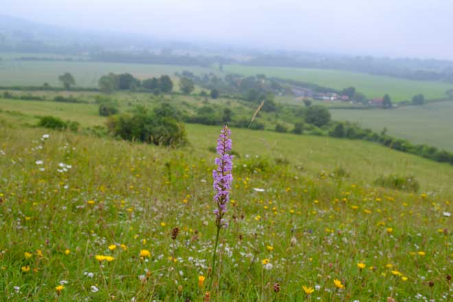 Two walks around Shoreham at the weekend in subtly different conditions. On Saturday we went looking for orchids on the eastern valleys route. It was a mostly cloudy day but with good visibility. Towering cumulus held the promise of a storm in the evening – well, one did materialise even yielding a funnel cloud in a near-tornado touchdown in east London – and the humidity was something else, even in these chalk upland valleys which trap heat and moisture.