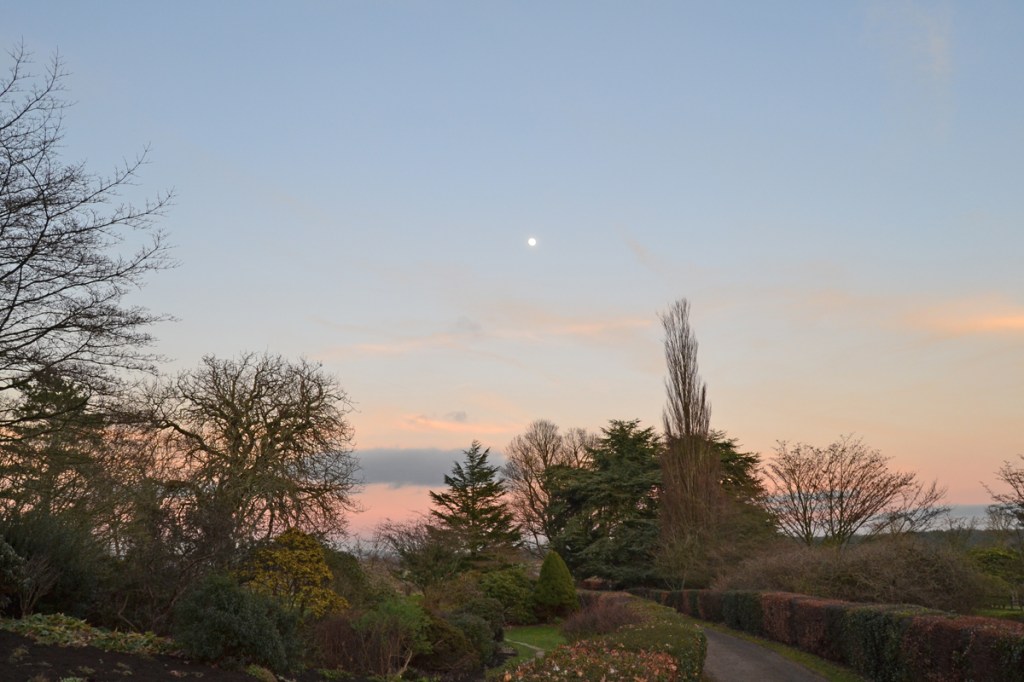 My previous post referred to getting lucky with the light on dark winter days. At Ide Hill last Friday, the cloud layers parted to reveal a magnificent dusk sky full of colour. Photos don’t really capture it, and my basic digital SLR Nikon isn’t really up to capturing the Moon properly, but I’d like to post a few just to remind myself of this wondrous early evening. It was another reminder that late afternoon can be a superb time to go out – there’s no need to postpone a winter hike just because you’ve been busy in the morning and didn’t manage to get away.