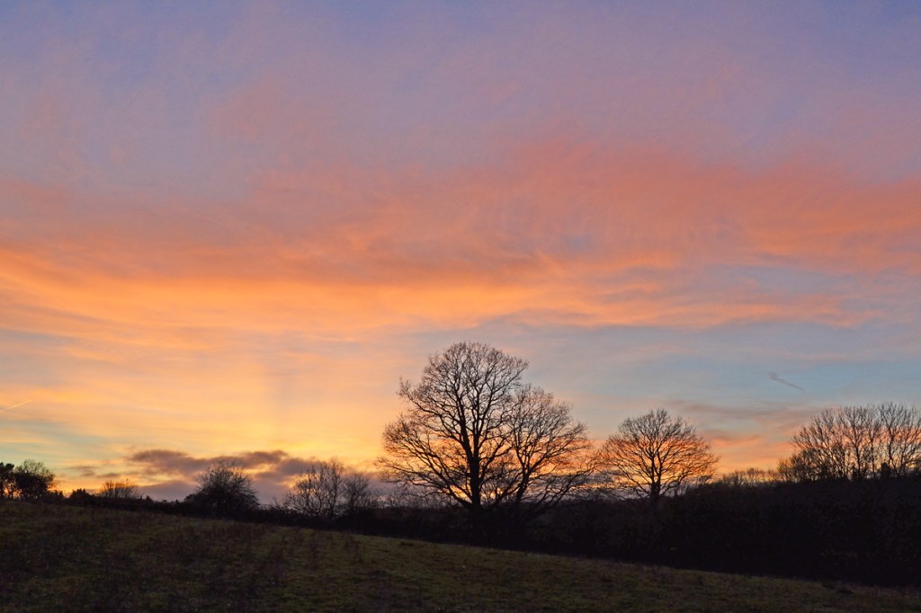 With Saturday a washout it was a real pleasure on Sunday to find time for the Ide Hill route (a three-hour round trip from SE London). For some reason I often take this Greensand Ridge walk while my chosen football team is playing so it’s rarely the relaxing stroll it ought to be. Fortunately, after initial tension, the goals came in a rush so by the halfway point all was well and I could enjoy the subdued January colours, stillness of the woods and occasional bird calls. A huge buzzard glided away from us soon after leaving Scord’s wood leaving a cacophony of jackdaw and carrion crow calls its wake. There were few other birds evident though, a few robins, wrens and a dunnock the only compensation for the finches I was hoping for. The tiny cricket pitch at point 5 seemed even more titchy with no one on it. We caught the sun as it slipped out of the blue sky into a solid-looking bank of cloud draped across the western horizon as far as the eye could see. This gave us a strangely false sunset, and an early dusk at odds with the sky overhead. But those weald views – fantastic as ever. A pint in the cosy Cock Inn was a perfect way to conclude proceedings. Oh, happy new year by the way.