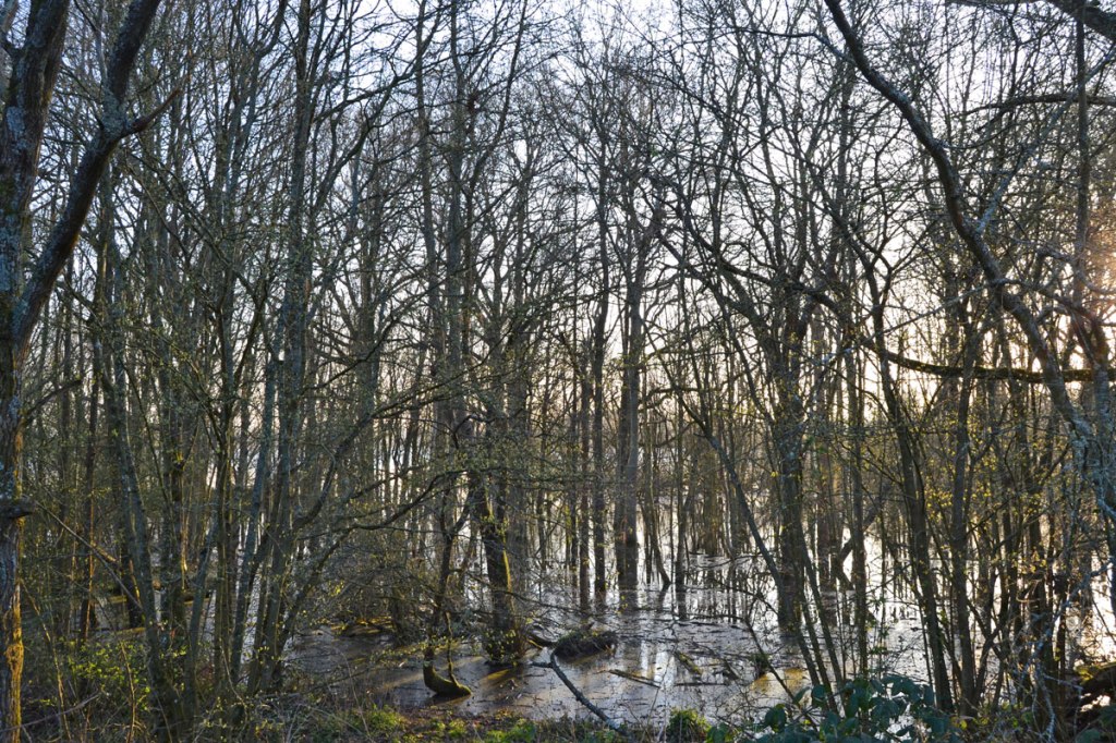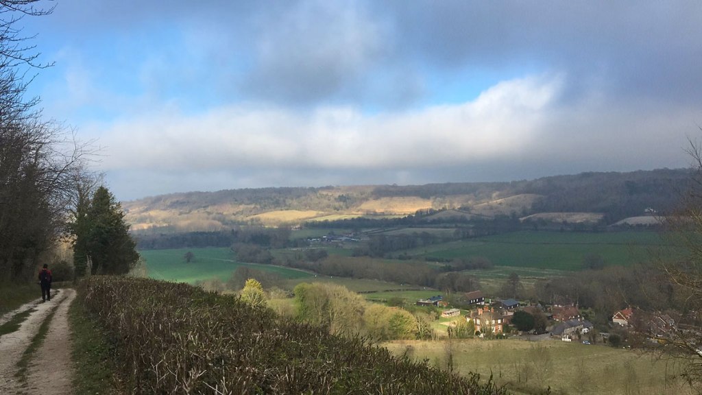Before we start waxing lyrical about spring, wildflowers, birds and bees etc etc let’s salute the beauty of woods in late winter, particularly in March, which tends to be sunnier than February and reflects all kinds of subtle auburn nuances in the leafless trees. Around Bough Beech reservoir near Ide Hill the woods have been partially flooded by high water levels making for scenes somewhat reminiscent of the opening parts of that excellent film The Revenant. On the final Saturday in March the first bluebells, generally those in sunny spots in hedgerows, were showing, along with primroses, cuckooflower and so on but those trees around the north lake at Bough Beech in the late afternoon sun in their best end-of-winter finery stole the show. What a superb place that is to watch the sun go down. Pictured below: swamped woods at Bough Beech, silver birches in Stock Wood on the Hever walk, a stream though light woods at Bore Place, and a view back to the Greensand Ridge and Ide Hill across fallow fields from near Bough Beech on a perfectly serene late March day – winter’s last knockings. Finally, an iPhone pic of Shoreham and the Darent Valley on the Polhill/Shoreham Circular walk on Sunday 27 March… a rare day of low misty cloud and sunny patches.