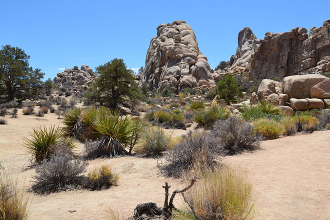 A variety of flora in Joshua Tree national park. One of the trees here (left, back) is a pinyon pine, once a great food source for Native Americans and still a vital part of the area’s ecology. Sadly, global warming and pine bark beetles have seen the pinyon trees die off in many areas of the park