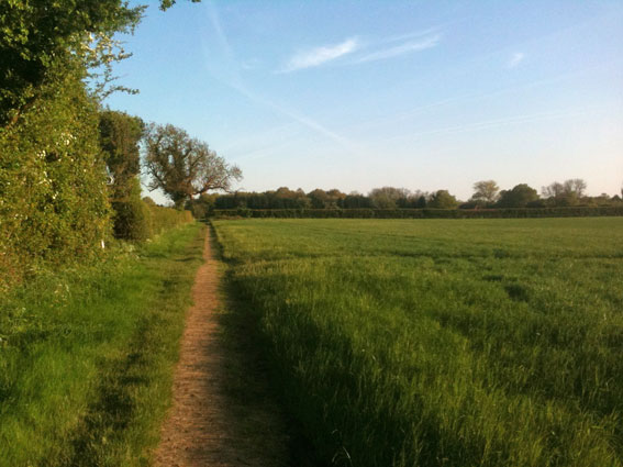 Follow the edge of a field to the left (east) then right (south). At Point 3 take the path heading east (left, heading away from Down House) at the intersection of footpaths heading towards woods between hedgerows.