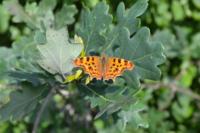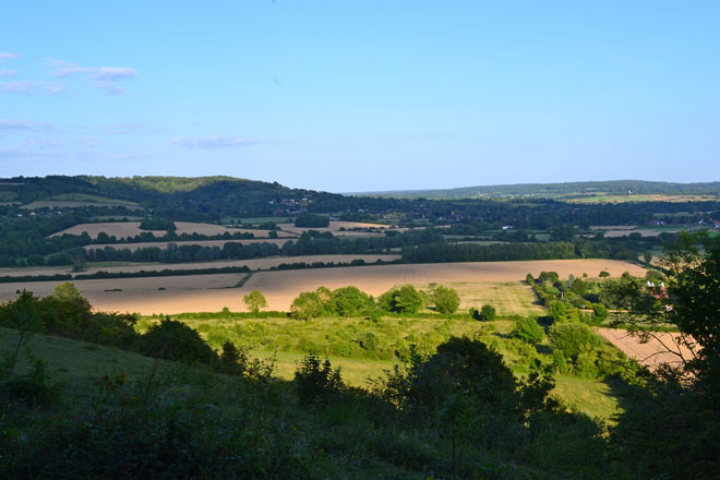 Plonk the jam jar in the Andrews Wood car park (confusingly called Shoreham Woods by Sevenoaks council). Cross the bridge over the M25 into mixed woodland. Follow the path as it bends to the right (south) just past a bit of wooden fencing (ignoring the path that goes straight on). Here, the woods become mainly of beech trees – notice how the undergrowth thins out, which is because beech trees ‘control’ undergrowth with various natural substances. Excellent bluebells here in April. After a couple of hundred metres in the beech woods, emerge from the woods at a gate into an attractive semi open area above a dry valley planted with hawthorns. You are still quite close to the motorway on your right. Follow the path straight on heading downhill (rutted in summer; waterlogged in winter!) then cross the valley floor with its little spring, heading east then uphill and join the main Polhill north-south path on the top of the ridge by a large field with a superb view over the Darent Valley. This is point 2.