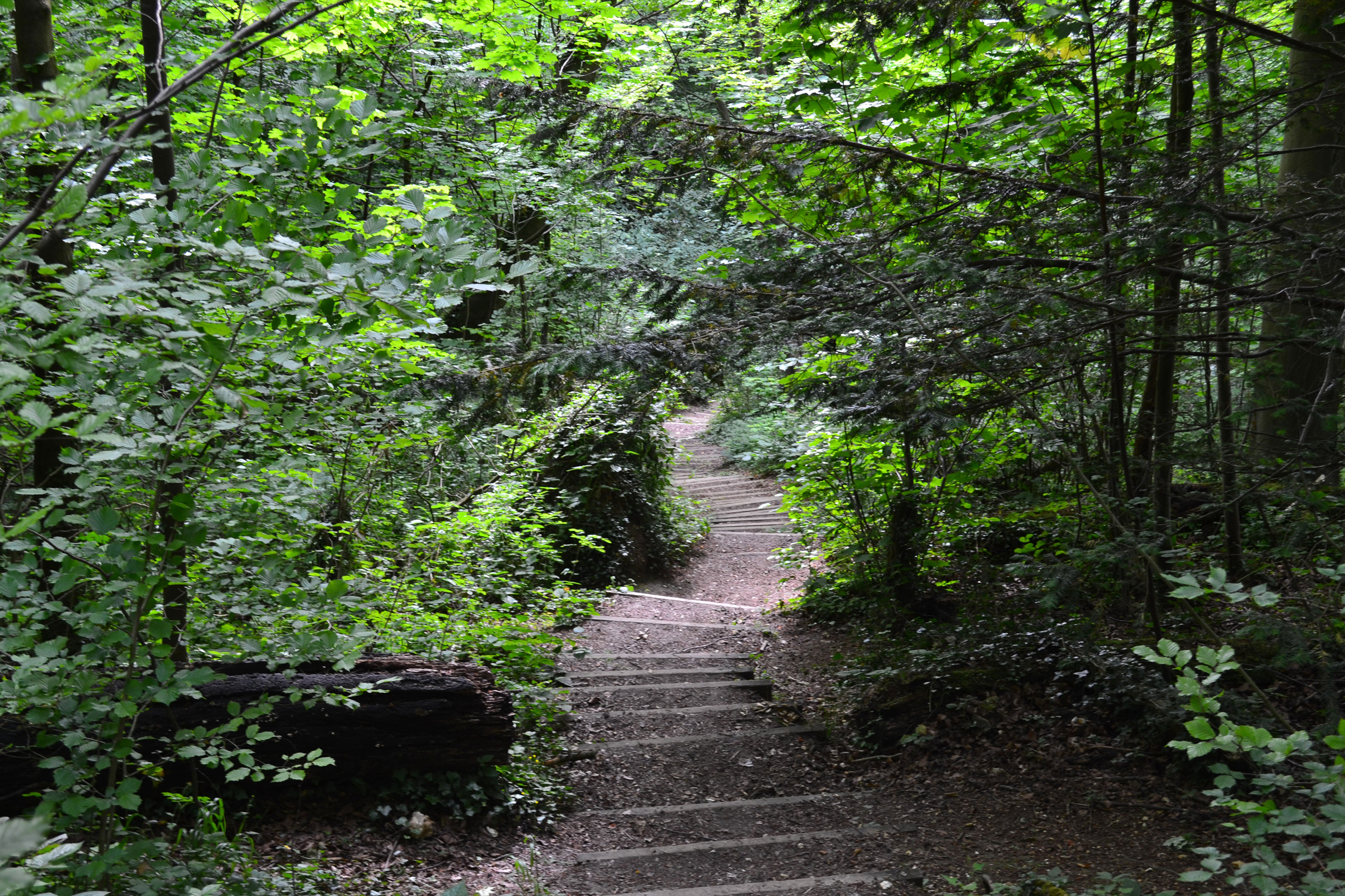 The path eventually bends round to the right, after a gate, (point 10) leading across a pleasant, shallow valley up to a farm. If you look directly down the valley you should see the the Queen Elizabeth bridge at Dartford. Continue on the track towards farm buildings (Dunstall Farm). When you get into the farm yard turn right and look for the continuation of the path on the left through a field with crops. If you find yourself walking past the Round House, which houses bulls and cows you’ve gone a bit too far. The path on the left is just before this, not quite opposite the Round House. I like the fact the farmer’s relaxed about the footpath going past his precious livestock. Take the path, which heads to more woods (point 11). Enter the woods, which must be pretty ancient, and soon find yourself descending on steps among giant beeches. This woods is very impressive and atmospheric.